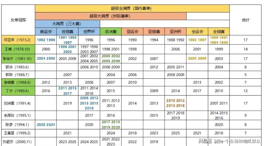 李晓霞三位大满贯选手,从2000年至2012年四届奥运会,女单金牌始终被其门下弟子稳稳包揽,"大满贯之父"的称号实至名归。
