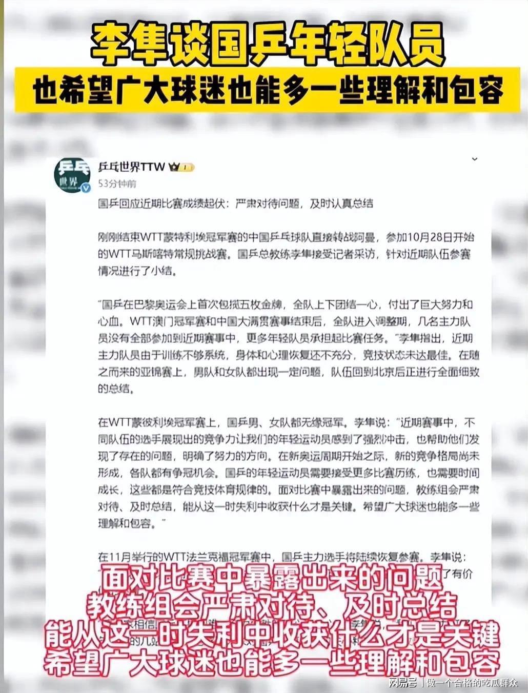2022年以59岁高龄成为国乒史上最年长总教练,李隼在任期间不仅带领女队屡夺佳绩,更顺利完成新老交替,让孙颖莎等新生代顺利接棒。